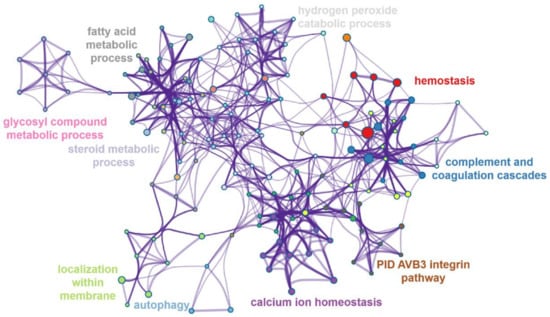 We mapped the interaction network for the downregulated proteins in Figure 7. The results showed that DEPs were strongly enriched in the glycosyl compound metabolic process, fatty acid metabolic process, hydrogen peroxide catabolic process etc., and these pathways were closely related to each other.