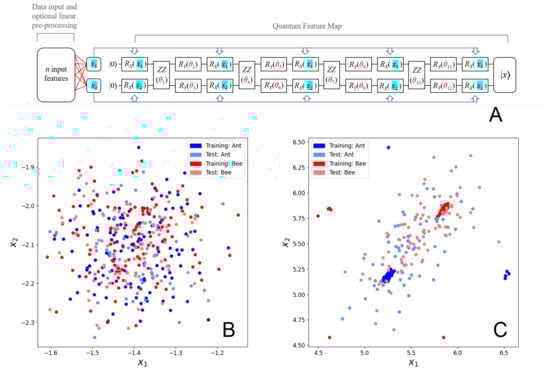 Various adaptations of Lloyd et al.’s hybrid quantum metric learning embedding [] were used throughout this work. See Figure 1A for a full illustration of the general embedding. The quantum component of the algorithm (the trainable quantum feature map, a repeating circuit ansatz consisting of single-qubit , rotation gates and two-qubit coupling gates [,] resulting in 12 trainable quantum parameters) was left unchanged. The classical components leading to the intermediate and inputs to the quantum feature map were replaced and varied. We note that the quantum circuit is precisely the same as that of Lloyd et al. []. The example ansatz in Figure 3 of [] is for three inputs (, and ). However, we and Lloyd et al. [] use two inputs ( and ) to assess QML on real world datasets.