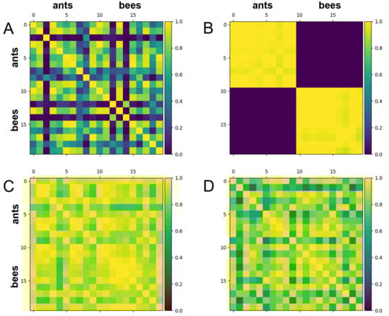 Gram matrices for mutual data overlap (i.e., ) in Hilbert space for 10 ant and 10 bee samples from the Hymenoptera dataset where 0 and 1 correspond to no and perfect overlap, respectively. In each case, 512 ResNet features (corresponding to 1024 trainable linear parameters) were used. The stronger the separation between the purple tiles (bees) and the yellow tiles (ants), the better the model’s ability to classify. The Hymenoptera dataset’s default train-test split was used for these results. The PennyLane software package was used to train the embedding []. (A) Mutual data overlap in Hilbert space for training set datapoints at optimization step 0. (B) Mutual data overlap in Hilbert space for training set datapoints at optimization step 1500. (C) Mutual data overlap in Hilbert space for test set datapoints at optimization step 0. (D) Mutual data overlap in Hilbert space for test set datapoints at optimization step 1500.