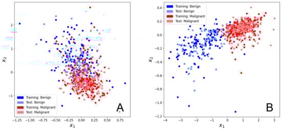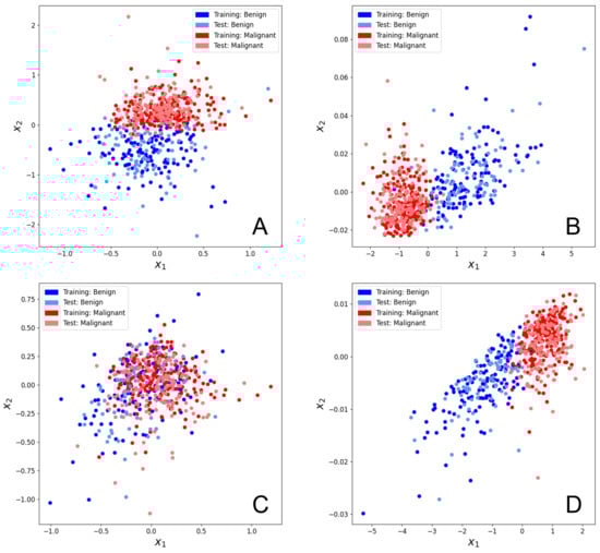 Figure 5 demonstrates the effects of carrying out PCA on the 30 input features of the breast cancer dataset. As seen in Figure 5B,D, PCA seems to bring both training set and test set (, ) values into tighter two-dimensional clusters compared to those seen in Figure 3B. This generally has the effect of reducing the relative surface area of the borders between neighboring clusters, which could potentially correlate with better classification after subsequent embedding.
