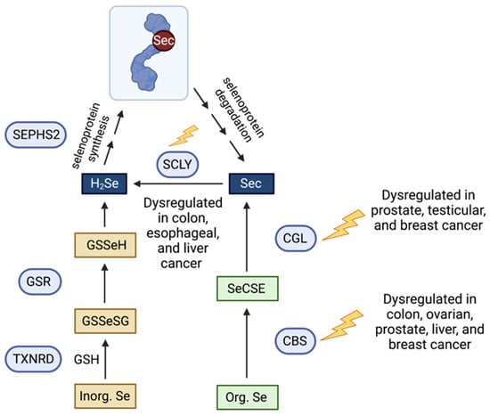 Schematic representation of the organic and inorganic Se metabolic pathways, Sec decomposition and their dysregulation in cancer. Arrows indicate direction of reaction. Blue circles represent enzymes; squares represent selenometabolites. GSH, glutathione; GSR, gluthathione reductase; TXNRD, thioredoxin reductase; GSSeSG, selenodiglutathione; GSSeH, glutathioselenol; H2Se, hydrogen selenide; SEPHS2, selenophosphate synthetase 2; Sec, selenocysteine; SCLY, selenocysteine lyase; CGL, cystathionine gamma lyase; CBS, cystathionine beta synthase; SeCSE, selenocystathionine.