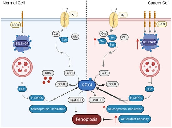 Increasing evidence suggests Se plays a significant role in ferroptosis, an iron-mediated cell death that is characterized by the accumulation of lipid peroxides that will eventually rupture the plasma membrane [64]. The main inhibitory pathway of ferroptosis described until now consists of the system Xc/GSH/GPX4 [65]. System Xc− is the heteromeric antiporter that transports cystine into the cell. Cystine enters the cell to participate in the biosynthesis of GSH [66], which is a cofactor for the action of selenoprotein GPX4 [67]. GPX4 reduces toxic lipid peroxides into non-toxic lipid alcohols [65,68], preventing the accumulation of ROS. Hence, GPX4 is a primary regulator of ferroptosis as it directly curbs the accumulation of lipid peroxides [18]. GPX4 is a selenoprotein that requires Se to be synthesized, hence the ferroptosis response may be deemed Se-dependent [69]. Ferroptosis may be triggered when GPX4 is inactive, and ROS accumulates in the cell [69]. Remarkably, cancer cells increase the intake of Se and Sec to potentially control GPX4 levels and warrant themselves resistant to ferroptosis.