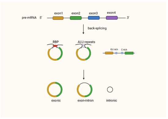 CircRNAs can be the main product generated from the host gene [15], for instance, the human cytochrome P450 gene, the rat androgen-binding protein (ABP) gene [20], the human dystrophin gene [21], and the human inhibitor of cyclin-dependent kinase 4 (INK4/ARF)-associated non-coding RNA [22]. CircRNAs can be classified as exonic circRNAs (ecircRNAs), intronic circRNAs (ciRNAs), or exon–intron circular RNAs (EIciRNAs). Most circRNAs are ecircRNAs, accounting for over 80% of known circRNAs [23], and they are mainly located in the cytoplasm [24,25], while EIcircRNAs and ciRNAs are usually found in the nucleus [26]. Exon-derived circRNAs are produced by a specific type of splicing known as post-snap [6]. Splice sites with specifically canonical splice sites accomplish post splicing [20,27]. In this type of splicing, the 5’ splice donor attacks the upstream 3’ splice site. This results in a 3’−5’phosphodiester bond that generates a circular RNA molecule [28]. There are also circRNAs that are formed by intron pairing, which are formed by the bringing of the splice donor site and the upstream splice acceptor site into proximity in order to form a loop via reverse complementary sequences, such as ALU repeats [29]. In the RNA-binding protein (RBP)-mediated model, the specific trans-activator RBP binds specifically to each flanking intron, forming a bridge that brings the splice donor and acceptor sites close enough to form a loop [30] (Figure 1).
