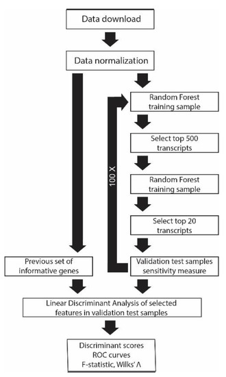 The normalized data values for the predicting sets of transcripts were analyzed by multivariate discriminant analysis GB-STAT v.10 (Dynamic Microsystems, Inc., Silver Springs, MD, USA.). Linear discriminant analysis is a generalization of Fisher’s linear discriminant and maximizes the separability among the two categories. A linear discriminant function (weighted sums of the transcripts) was computed for maximum separability of the two groups where the coefficients or discriminant scores are used to classify as disease or controls.