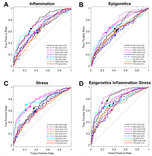 Receiver operator characteristic (ROC) curves for functional group features in AD and other neurodegenerative diseases. ROC curves generated from discriminant scores of linear discriminant analysis using group features selected empirically from literature for each of three functional groups (A) inflammation, (B) epigenetics, and (C) stress. (D) ROC curves for combined analysis of all 22 transcripts for the three groups. Line colors denote specific neurodegenerative disease tested and line points mark LDA selected threshold for each. ROC curve line color: AD (black), HD (cyan), FRDA (orange), PD (blue), ALS (pink), and FTD (red). AUC: area under curve probability for predicting classification of disease.