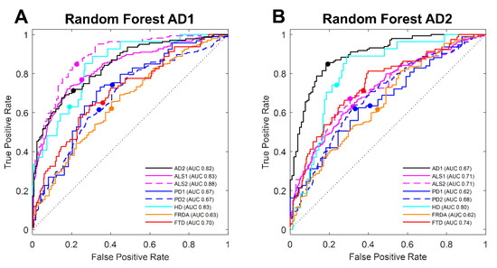 For each disease cohort dataset, the respective group of twenty transcripts selected by RF to discriminate between disease and controls were further validated using LDA on the test samples set aside for the validation step. The results for AD groups (AD1 and AD2) are plotted together in Figure 3a,b (black lines) with excellent discrimination for both RF transcript sets, AD1 picks (AUC 82%) and AD2 picks (AUC 87%). The group of features selected for each of the ALS cohorts classified disease and control samples with excellent accuracy (ALS1, AUC 91%; ALS2, AUC 90%) (Figure S2c,d). Similarly, features selected on training sets with PD cohort datasets and validated using the isolated test sets generated exceptional accurate classification (PD1, AUC 97%; PD2, AUC 83%) (Figure S2a,b) using multivariate LDA analysis. In the case of HD, training generated 20 transcripts; however, the number of samples in the test set was limited by the size of the disease cohort, and only 10 of the twenty transcripts picked could be used for LDA. A selection of the top 10 ranked features by the RF were used in the analysis on the test set, which, regardless of the reduced number of transcripts, had excellent classification (AUC 89%) (Figure S2e). The LDA analysis for both FTD and FRDA also provided good classification (FTD, AUC 75% and FRDA, AUC 80%) (Figure S2f,g).