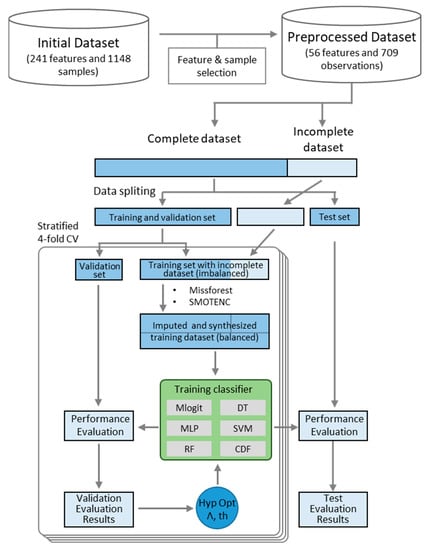 MissForest is an RF-based data imputation method that can yield increased performance in classification problems relative to that of other methods when applied to a dataset containing both continuous and categorical variables [20]. Let the data matrix be an n-by-p matrix containing missing values, where n and p represent the numbers of subjects and features, respectively. Depending on the missing values, X is divided into four parts as follows: (1) the observed part of variable is denoted as ; (2) the missing part of variable is denoted by ; (3) variables other than with observation are denoted by ; and (4) variables other than with observation / are denoted by . The missForest algorithm can be conducted as follows. (1) For a variable with missing data X, the missing values are replaced by the mean or mode of the remaining data; the mean is used for continuous variables, while the mode is employed for categorical variables. (2) For each variable with missing values, the built from the RF model on the observed and is grown, and the missing part is predicted and replaced; this also based on the RF model. These processes are repeated until a stopping criterion is met or the maximum number of iterations is reached.