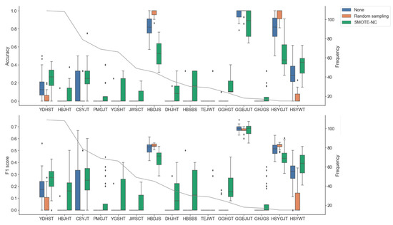 The distribution of F1 score and top-1 accuracy according to the oversampling method using cascade deep forest. The box color indicates the oversampling methods and the gray line refers to the frequency of herbal formulae shown in the KDC data set.