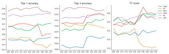 We further evaluated whether data imputation could further improve performance. We expected that the performance of the recommendation model could be further improved if a sample with a high ratio of valid features acquired through imputation could be used for classifier training. We measured the prediction performance using a synthesized dataset by applying data imputation and oversampling to the training dataset. To find the optimal criteria for imputation, we selected the samples to be imputed and compared their performance while sequentially increasing the threshold of the nan ratio from 0 to 0.5. We found that the performance of classifier models progressively improved up to a nan ratio of 0.35 (Figure 3). In particular, the CDF model achieved a superior F1 score with the highest top-1 accuracy and top-3 accuracy at a threshold of 0.35. However, after this threshold, we found that the prediction performance decreased, especially for the F1 score, even if the nan ratio was higher. This result indicates that the imputation of appropriate samples and their utilization for subsequent supervised learning can contribute to constructing an optimized prediction model.