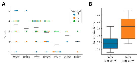 We tried to evaluate the interpretation results by expert’s manual audit. The remaining 22 instances included in the case study dataset were considered as data for model evaluation. We applied LIME to each instance consisting of the patient’s clinical symptoms and administered HFs, and identified the top-weighted features and their descriptions in a form similar to the representative example. We then invited three SCM experts to rate whether these features were appropriate for choosing a HFs on a scale of 1 (most inappropriate) to 5 (most appropriate). The results showed that the average score of evaluation was close to normal (2.94) (Figure 4A). JWSCT had the highest average score with 3.7 points, followed by CSYJT (3.4 points) and HBDJS (3.3 points). Then, we evaluate the consistency of the interpretation results. We expected that if the overlap between the features with high weights in the same prescription was higher than that between other features, it would support the consistency of our model. We calculated the weight of each clinical symptom for the top predicted HF from each case study dataset using LIME. Then, we calculated the Jaccard similarities between the top 10 features of the same prescription (intra-similarity) and different prescriptions (inter-similarity). The results showed that the intrasimilarity was significantly higher than the intersimilarity (p < 0.001, Figure 4B), indicating that the LIME model interprets with consistent criteria.