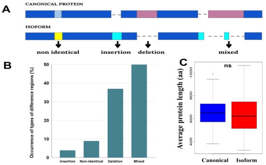 (A) Schematic representation of four groups of difference regions (dark blue and pink colors indicate identical and non-identical regions in the sequences, respectively). (B) Occurrence of types of the difference regions. (C) Distributions of the average length of canonical proteins and isoforms in proteomes. The distributions contain 58 points corresponding to the average length of each proteome. Here, ns means non-significant difference with p-value > 0.05.