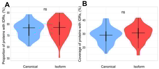 Violin plots of proportion and coverage of proteins containing IDRs in canonical and isoform proteins. The distributions contain 58 points corresponding to each proteome. (A) Proportion of proteins with IDRs in canonical proteins and isoforms. The difference between 2 sets is non-significant. (B) Coverage of IDRs in canonical proteins and isoforms. The coverage in isoforms is slightly higher; however, this difference is non-significant.