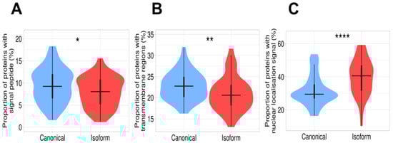 Difference in subcellular localization between canonical proteins and isoforms. (A) Proportion of proteins containing signal peptides. This value is significantly higher in canonical proteins than in isoforms. (B) Proportion of proteins containing transmembrane regions. The plot demonstrates a significant decrease in transmembrane proteins in the isoform set. (C) Proportion of proteins with nuclear localization signal. Isoforms have a remarkably high proportion of nuclear localization signals in comparison with canonical proteins. Signes *, **, **** mean significant differences with p-value < 0.05, p-value < 0.01, and p-value < 0.0001, respectively.