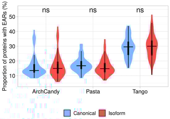 We estimated an average aggregation potential of canonical proteins and isoforms by the proportion of EAR-containing proteins predicted by one of the predictors (ArchCandy, Pasta, Tango) in these two datasets. Our analysis revealed that the median value of proportion for isoforms with EARs is almost the same as for canonical proteins (Figure 4 and Supplementary Table S3).
