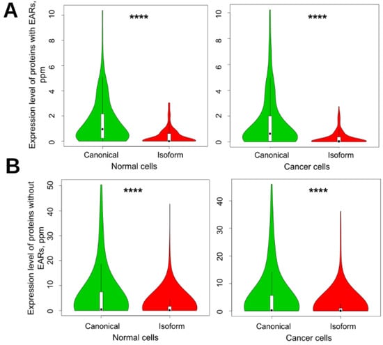 Violin plots of expression of canonical proteins and their isoforms in normal and cancer cells. (A) EAR-containing proteins and (B) non-EAR-containing proteins. EARs were predicted by using the ArchCandy program. Mean levels of expression for EAR-containing canonical proteins and isoforms in normal cells were 1.565 and 0.386, respectively, and in cancer cells, 1.490 and 0.306. For non-EAR-containing proteins, these values were 5.784, 1.773, and 4.984, 1.499, respectively. In accordance with t-test, all results were significant, with p-values of less than 10−13. **** means significant difference with p-value < 0.0001.