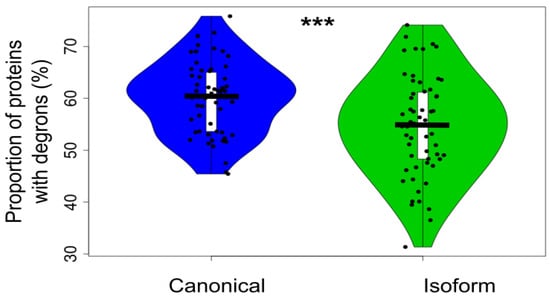 The abundance of proteins in the cell mostly depends on the balance of two opposite processes: expression and degradation. In general, canonical proteins have a higher level of cellular expression in comparison with their isoforms. It was interesting to understand if there is any difference between these proteins in terms of their degradation. The experimental data on protein degradation is limited and controversial. We compared canonical and isoform proteins in silico by analyzing the occurrence of degron motifs by TAPASS [20]. The degrons are short linear motifs that increase the targeting of proteins for degradation [48,49]. We found that canonical proteins have a higher proportion of degrons in comparison to the isoforms and this difference is statistically significant (Figure 6 and Supplementary Table S6).