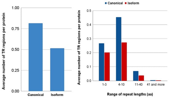 Many protein sequences contain arrays of repeats that are adjacent to each other [50,51] tandem repeats (TRs). Several authors have proposed that TRs might have evolved by exon duplication and rearrangement [52,53]. Therefore, it was interesting to get insight into the difference between canonical proteins and isoforms in these particular regions. We detected TRs in five well-annotated proteomes (H. sapiens, M. musculus, D. melanogaster, D. rerio, A. thaliana) by using MetaRepeatFinder (MRF) (https://bioinfo.crbm.cnrs.fr/index.php?route=tools&tool=15 (accessed on 6 July 2022)). These proteomes contain a total of 44,357 canonical proteins. We found that a large part (43%) of them contains at least one TR region, and each TR-containing protein has, on average, about two TR regions. A comparison of the occurrence of the TR regions in canonical proteins and isoforms revealed that isoforms have fewer TR regions than canonical proteins (0.5 vs. 0.81 TR region per protein) (Figure 7A). It is especially noticeable for TRs with a repeat length of 4–10 residues (Figure 7B). Partially, the decrease in TRs in the isoforms can be explained by the fact that among the differences between canonical proteins and isoforms, we predominantly observed deletions (see Section 3.1). It was interesting to study the relationship between the location of the TRs and the difference regions. Our analysis showed that among the difference regions detected in the aligned pairs, a significant part (35%) overlaps with TRs.