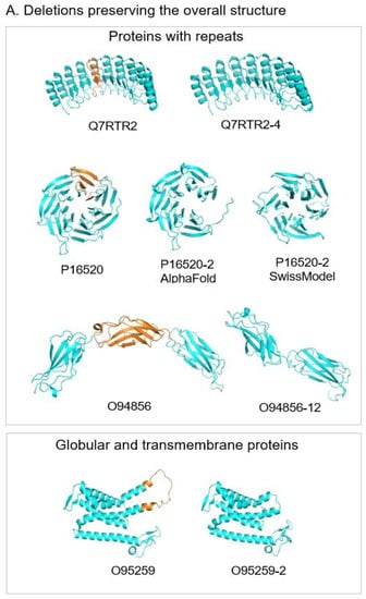 Among 51 analyzed pairs, there are 20 globular structures, representing 38% of the cases, with the deletions of exons in the middle of the structure. In most of these cases, the deletion does not lead to critical structural transformations (Figure 8A). In some cases, it makes shorter loops preserving α-helices or β-strands; sometimes, it removes one or several transmembrane helices. At the same time, these deletions can lead to changes in the binding properties of the isoforms and (or) changes in the oligomerization states of the protein [56].