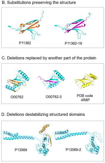 Ribbon representation of AlphaFold models of canonical proteins (left) and their isoforms (right). Fragments of canonical proteins deleted in the isoforms are in orange. Fragments of isoforms that substitute deleted fragments of the canonical proteins are in magenta. Representative structures of each subgroup from top to bottom are: (A). Deletions preserving the overall structure. Q7RTR2, LRR-protein of NLR family CARD domain-containing protein 3; P16520, 7-bladed beta-propeller of Guanine nucleotide-binding protein G(I)/G(S)/G(T) subunit beta-3. AlphaFold model of isoform represents 6-bladed structure with an open beta-propeller, SwissModel structure made based on the known 6-bladed structure (PDB code 1E1A) has closed beta-propeller; O94856, neurofascin; O95259, potassium voltage-gated channel subfamily H member 1; (B). Substitutions preserving the structure. P11362, fibroblast growth factor receptor 1; (C). Deletions replaced by another part of the protein. O00762, ubiquitin-conjugating enzyme E2 C, on the right, in yellow, the known crystal structure of ubiquitylation module similar to the truncated structure of the isoform in the center; (D). Deletions destabilizing structured domains. P13569, cystic fibrosis transmembrane conductance regulator.