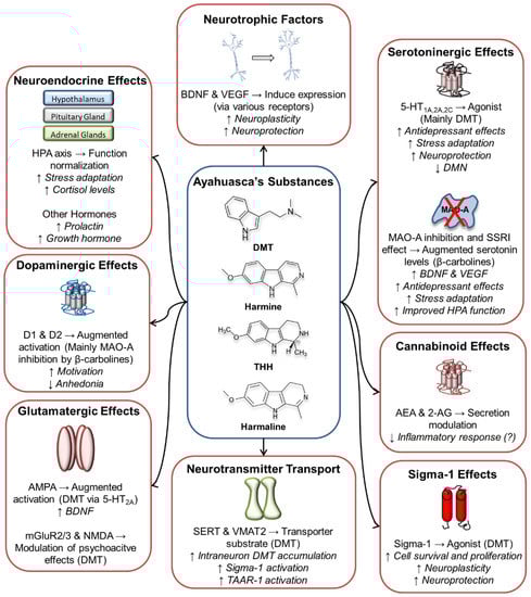 The following paragraphs will focus on the molecular targets of ayahuasca and its constituent substances in several neurotransmission systems. Figure 1 below summarizes the main effects described.