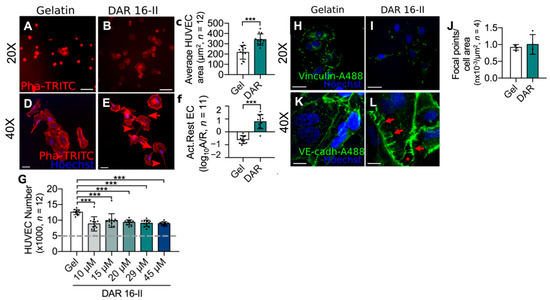 Figure 1. HUVEC are activated on exposure to DAR 16-II. (A,B) Representative images (Pha staining, 20× OM, scale-bars= 30 μm) of HUVEC cultured in the presence or absence of DAR 16-II at 30 min post seeding; (C) evaluation of cells’ average area; (D,E) representative images (Pha Staining, 40× OM, scale-bars = 30 μm) of HUVEC grown on gelatin or DAR 16-II. Dar-16-II induces morphological changes, i.e., the presence of filopodia (red arrow) and lamellipodia (red arrowhead) is suggestive of an activated, migratory phenotype; (F) quantification of the ratio between “activated” and “quiescent” HUVEC; (G) proliferation of HUVEC (24 h) when cultured in different concentrations of DAR 16-II or gelatin as control (the grey dashed line indicates the input number of HUVEC = 5 × 103); (H,I) representative pictures (Vinculin immuno-staining, 20× OM, scale-bars = 30 μm) demonstrating the re-distribution of focal adhesions in HUVEC seeded in the presence of DAR16-II when compared to the control; (J) quantification of vinculin-positive foci per cell area; (K,L) representative images (VE-Cadherin immuno-staining, 40× OM, scale-bars = 10 μm) showing inter-endothelial junctions of HUVEC monolayers grown on DAR 16-II or gelatin. HUVEC cultured on DAR 16-II display interdigitating junctions (red arrows) with discontinuities (red asterisk). *** p < 0.05.