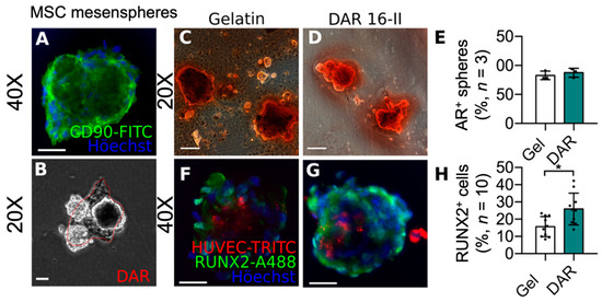 Figure 3. (A) Expression of the mesenchymal stem cell marker CD90 on freshly generated mesenspheres (40× OM, scale-bar = 100 μm); (B) representative picture (20× OM, scale-bar = 100 μm) showing mesenspheres’ adhesion to DAR 16-II; (C,D) representative pictures (20× OM, scale-bar = 100 μm) of Alizarin red-stained mesenspheres grown under osteogenic conditions; (E) average number of alizarin positive spheres (average of three independent experiments counting twenty spheres for each experiment); (F,G) representative pictures (40× OM, scale-bars = 100 μm) of RUNX2 immuno-stained mesenspheres; (H) percentage of RUNX+ cells/mesensphere (average of ten spheres from three independent experiments). * p < 0.05.
