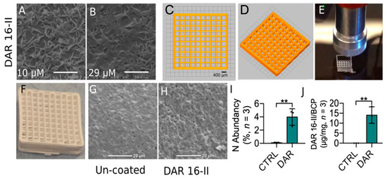 Figure 4. The preparation and characterization of 3D-printed BCP scaffolds enriched with DAR 16-II. (A,B) SEM imaging of DAR-16-II-coated glass slides: DAR 16-II formed nano-structures with major axes in the 250–500 nm range, and presenting finer irregularities in the 50–100 nm range; (C,D) BCP 3D-printed scaffolds with 400 μm pores; (E,F) 3D direct printing of BCP at 200 μm resolution and the final scaffold after sintering; (G,H) SEM images of un-coated or DAR-16-II-coated BCP; (I) elemental analysis of BCP-coated and un-coated samples (three randomly picked spots per sample) demonstrated the presence of nitrogen on the BCP surface related to the peptide coating; (J) quantification of DAR 16-II adsorption on the BCP scaffolds through a micro-BCA assay. ** p < 0.01.