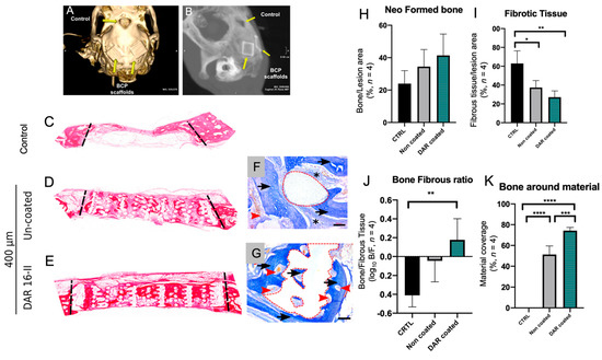 Figure 5. In vivo evaluation of DAR-16-II-coated 3D printed BCP scaffolds (n = 4). (A,B) CT scan and X-ray images of calvaria defects, either left empty as a control or implanted with BCP scaffolds (yellow arrows); (C) image of a section of calvaria bone defect, without an implant, used as a control; (D,E), calvaria sections of implants with 400 µm un-coated or coated with DAR 16-II; pictures are reconstructions from 100× OM images; (F,G) representative histological images (Azan stain, 100× OM, scale-bars = 100 μm) of calvaria bones implanted with 3D-printed scaffolds (red dashed line). Black arrows indicate neo-formed bone, black asterisks indicate fibrotic tissue, and red arrowheads indicate blood vessels; (H) quantification of the total bone formed within the lesion area; (I) quantification of the total fibrous substitution within the lesion area; (J) ratio between neo-formed bone and fibrous substitution; (K) quantification of the material covered by the neo-bone (percentage of material surface, red dashed line, in contact with bone). * p < 0.05, ** p < 0.01, *** p < 0.001, **** p < 0.0001.
