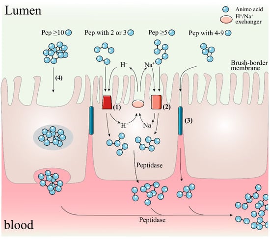 - Wang, B.; Li, B. Effect of molecular weight on the transepithelial transport and peptidase degradation of casein-derived peptides by using Caco-2 cell model. Food Chem. 2017, 218, 1–8. [Google Scholar] [CrossRef] [PubMed]