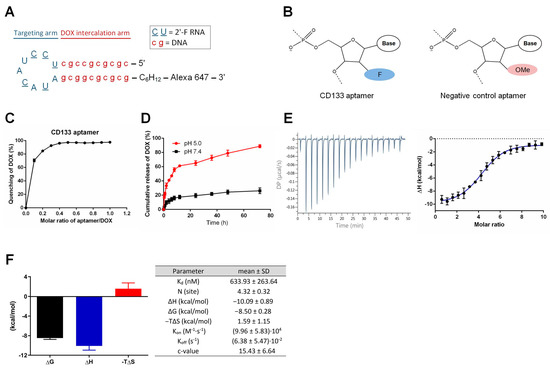 Schematic illustration of the hybrid RNA-DNA CD133 aptamer and characterization of the CD133 aptamer-doxorubicin conjugates (CD133-DOX). (A) The predicted secondary structure of the CD133 aptamer. A 10-bp DNA GC stem was engineered to replace the original RNA stem in the RNA aptamers, along with a 2′-fluoropyrimidine modification of all pyrimidines, 5′-methyl-dC in the stem, and an Alexa 647 fluorophore conjugation to the 3′-end of the CD133 aptamer. A hexylamine cap of the CD133 aptamer was added to the 3′-end for enhanced nuclease resistance. (B) The negative control aptamers are aptamers of the same sequence as the CD133 aptamer but with a 2′-O-methyl (OMe) modification instead of a 2′-fluoropyrimidine (F) modification at the pyrimidines (C and U), which changes the three-dimensional structure of the aptamer and thus abolishes the binding of the control aptamers to CD133. (C) In vitro pH-dependent DOX release from CD133-DOX at a pH of 5.0 and 7.4. (D) The intercalation of DOX into the CD133 aptamer. The fluorescence quenching of DOX (10 µM) after incubation with different aptamer concentrations (1, 2, 3, 4, 5, 6, 7, 8, 9, and 10 µM, respectively) for 30 min. (E) Isothermal titration calorimetry (ITC) of interaction between CD133 aptamer and DOX. Left, representative raw calorimetric data for titration of CD133 aptamer (2 µM) with serial injections of DOX solution (100 µM) (left). Right, binding isotherms resulting from the integration of the raw calorimetric data. (F) Left, the thermodynamic signature for titration by stepwise injection of DOX into CD133 aptamers. Right, thermodynamic parameters for DOX binding to CD133 aptamers obtained by ITC at 25 °C. Data shown are means ± SD, (n = 3).