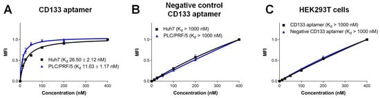 Characterization of the specificity of the CD133 aptamer. Alexa Fluor 647-labeled CD133 aptamers were incubated with indicated human cells and analyzed by flow cytometry. The median fluorescence intensity (MFI) was plotted against varying concentrations of CD133 aptamer (1–400 nM). (A) Binding of CD133 aptamer to CD133-positive Huh7 and PLC/PRF/5 cells. (B) Binding of the negative control CD133 aptamers to Huh7 and PLC/PRF/5 cells. (C) Binding of CD133 aptamers to CD133-negative HEK293T cells. Data shown are means ± SD, (n = 3).