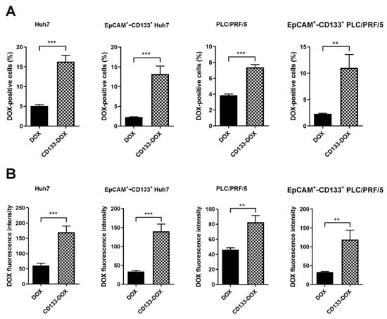 DOX accumulation in the bulk and EpCAM+-CD133+ population of the liver cancer Huh7 cells and PLC/PRF/5 cells. After incubation with free DOX or CD133 aptamer-DOX conjugates (200 nM for Huh7 and 100 nM for PLC/PRF/5) for 24 h, the intracellular accumulation of DOX was analyzed via flow cytometry. (A) The percentage of DOX-positive cells, and (B) the corresponding median intracellular DOX fluorescence intensity. Data shown are means ± SD, n = 3. ** p < 0.01; *** p < 0.001, compared to free DOX treatment.