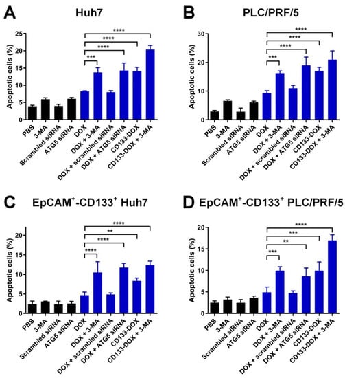 The effect of the inhibition of autophagy combined with the treatment of CD133 aptamer-DOX conjugates on DOX-induced apoptosis. The cells were treated with autophagy inhibitor 3-MA (2 mM) or ATG5 siRNA (200 nM) followed by the addition of either free DOX or an equivalent dose of CD133 aptamer-DOX conjugates (200 nM for Huh7 and 100 nM for PLC/PRF/5) for 24 h. The total percentage of apoptotic cells was defined by the combination of the percentage of 7-AAD-/Annexin V+ and 7-AAD+/Annexin V+ cells and are shown for the (A) bulk Huh7 cells, (B) bulk PLC/PFR/5 cells, (C) EpCAM+-CD133+ Hun7 cells, as well as (D) EpCAM+-CD133+PLC/PRF/5 cells. Data shown are means ± SD, n = 3. ** p < 0.01; *** p < 0.001; **** p < 0.0001; compared with that in the DOX-only treatment.
