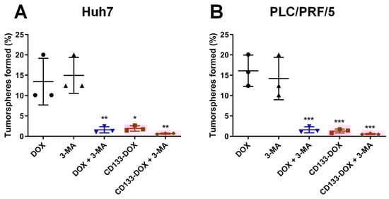 The percentage of tumorsphere formation determined 5–7 days after the treatment. The cells were treated separately with 3-MA (2 mM), DOX (200 nM for Huh7 and 100 nM for PLC/PRF/5), CD133 aptamer-DOX conjugates (equivalent to 200 nM or 100 nM DOX for Huh7 or PLC/PRF/5, respectively), 3-MA plus DOX or 3-MA plus CD133-DOX for 48 h. Cells were then plated onto ultra-low attachment 96 plates in stem cell culture media. The self-renewal capacity of cells in various treatment groups was analyzed using an in vitro limiting dilution assay. The frequency of tumorsphere-forming cells for (A) Huh7 and (B) PLC/PRF/5 under various treatments is shown. Data presented are means ± SD, n = 3. * p < 0.05; ** p < 0.01; *** p < 0.001, compared with DOX-only treatment.