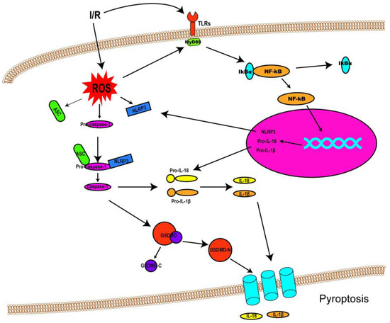 Schematic diagram demonstrating the link between pyroptosis and I/R injury. Following I/R insults, NF-κB signaling (priming) is activated by Toll-like receptors (TLRs), and ROS are also produced, resulting in NLRP3 inflammasome assembly and caspase-1 activation. Activated caspase-1 cleaves GSDMD into GSDMD-N and GDSMD-C and lyses the precursors of IL-1β and IL-18 (pro-ILβ and pro-IL-18, respectively) to form mature IL-1β and IL-18. Then, GSDMD-N oligomerizes and penetrates the cell membrane, forming non-selective pores on the membrane to release IL-1β and IL-18.