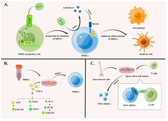 In addition, MDSCs can differentiate from bone marrow cells. It has been reported that PMN-MDSCs can be induced from CD33+ bone marrow by CD4+ T cells, which depend on direct cell-to-cell contact and tmTNF-α signal transduction []. Taken together, TNF-α participates in the induction of MDSCs through multiple pathways (Figure 1).