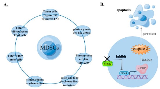 TNF signaling can inhibit the apoptosis of MDSCs in a variety of pathological models, by promoting the accumulation of MDSCs. Qin et al. found spontaneous suppression in the growth of transplanted tumors in Tnfr−/− mice []. Zhao et al. found that spontaneous tumor suppression is caused by the absence of TNFR in host cells rather than in transplanted tumors, which is associated with MDSC recruitment in peripheral tissues. In MDSCs purified from spleens of Tnfr−/− mice, NF-κB’s signaling and its downstream molecule cellular FLICE-inhibitory protein (c-FLIP) are downregulated, but activity of caspase-8 increases, suggesting that increased cell apoptosis is the main reason for the decreasing quantity of MDSCs in Tnfr−/− mice. Because there are two types of TNFR, signals mediated by TNFR2 are necessary and sufficient to protect MDSCs from apoptosis, while TNFR1 deletion has no significant effect on tumor growth, MDSC recruitment, the NF-κB signaling pathway, or induction of apoptosis []. Moreover, Ham et al. used a liver metastasis model, which indicated recruitment of MDSCs prior to tumor metastasis in the liver, thus contributing to the formation of a tumor microenvironment. TNFR2 plays important roles in this process because the proportion of apoptotic MDSCs is significantly increased in Tnfr2−/− mice [] (Figure 2).