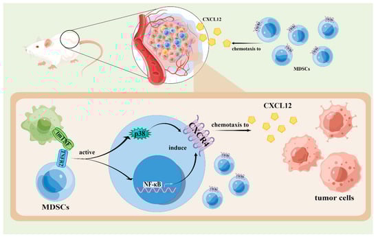 The effects of TNF signaling on the chemotaxis of MDSCs. The tmTNF activates NF-κB and p38 signaling pathways in MDSCs mediated by TNFR2, inducing their expression of CXCR4, and subsequently enhancing the chemotaxis of MDSCs in tumor tissues secreting CXCL12. The figure was created using Figdraw (https://www.figdraw.com/ accessed on 19 August 2022).