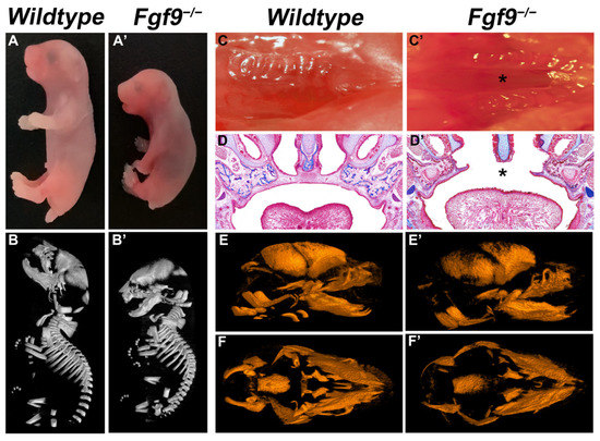 Craniofacial phenotypes of Wildtype and Fgf9−/− embryos. (A,B) Comparison of the size of (A) Wildtype and (A’) Fgf9−/− mice at E18.5 by gross observation (A,A’) and micro-CT scans (B,B’). Inferior axial views of (C) Wildtype and (C’) Fgf9−/− E18.5 palates. MT staining of coronal sections in (D) Wildtype, and (D’) Fgf9−/− palates. Lateral views of (E) Wildtype and (E’) Fgf9−/− craniofacial skeletons provided by micro-CT scans. Inferior axial views of (F) Wildtype and (F’) Fgf9−/− craniofacial skeletons provided by micro-CT scans. Black star * indicates cleft secondary palate.