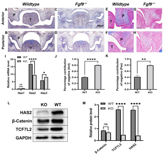 Analysis of HA and HAS2 expression in Wildtype and Fgf9−/− palate at E13.5. (A–D) Expression of HAS2 in (A,C) anterior, and (B,D) posterior coronal sections of Wildtype (A,B) and Fgf9−/− mutant (C,D) embryos. (E–H) Alcian blue-stained (E,G) anterior, and (F,H) posterior coronal sections of Wildtype (F,F) and Fgf9−/− mutant (G,H) embryos. (I) The impact of the knockout Fgf9 on the mRNA level of Has1-3 was examined by a qRT-PCR experiment in vivo. (J,K) Wildtype and Fgf9−/− (J) anterior, and (K) posterior palatal HAS2 expression was determined by quantification, and the proportion of IHC-negative cell was demonstrated. (L,M) Western blot analysis showed differences of HAS2, β-catenin, and TCF7L2 expression in Wildtype and Fgf9−/− palate. The bar graph represents the mean ± SEM. ns: no significance, p ≥ 0.05, * p < 0.05, ** p < 0.01, **** p < 0.0001. P, palate. T, tongue.