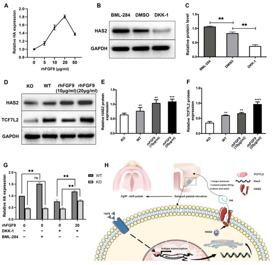 Mechanism of Fgf9 promoting HA expression. (A) Effect of different concentrations of rhFGF9 (0–50 µg/mL) on HA secretion in MEPM. (B,C) The protein levels of HAS2 in MEPM cells after treatment with BML-284 or DKK-1 were determined by Western blot assay. (D–F) The protein levels of HAS2 and TCF7L2 in KO MEPM cells and WT MEPM cells treated with 0, 10, or 20 µg/mL rhFGF9 were determined by Western blot assay. Asterisks indicate a significant difference from the KO MEPM cells.(G) Elisa analysis of HA expression in WT and KO MEPM with different treatment. (H) Schematic diagram of mechanism of this research. The bar graph represents the mean ± SEM. ns: no significance, p ≥ 0.05, ** p < 0.01, *** p < 0.001, **** p < 0.0001. Western blot analysis showed differences of HAS2, β-catenin, and TCF7L2 expression in Wildtype and Fgf9−/− palate.