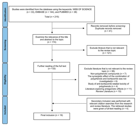 Searching with the search formula “Multiple myeloma” or “Myeloma, plasma cell” (subject) and “Bortezomib or Velcade” (all fields) and “flavonoids or polyphenols” (all fields) were put into WOS, 33 publications were found. Performing a search at PubMed with the search formula: ((Multiple myeloma or “Myeloma, Plasma-Cell”) AND (Bortezomib or Velcade)) AND (flavonoids or polyphenols), 38 publications were retrieved. Searching in Embase with the search terms: ((Multiple myeloma or “Myeloma, Plasma-Cell”) AND (Bortezomib or Velcade)) AND (flavonoids or polyphenols), 144 publications were retrieved. The filters had not been applied in any of the above three databases. Endnote 20 was used to check for duplicates automatically and by hand for 215 publications, and 41 duplicates were taken out. The titles and abstracts of 174 publications were reviewed by two independent reviewers (Kaixi Ding and Wei Jiang). In case no consensus was reached, a third independent reviewer made the final decision. 121 publications that were not relevant to the topic of this review were removed.