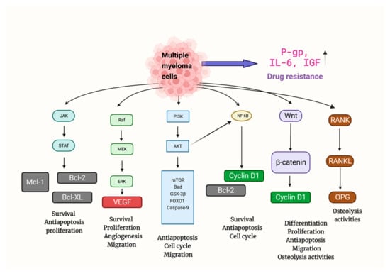 MM’s onset, progression, metastasis, and osteolytic destruction are associated with the regulation of multiple signaling pathways (Figure 2). Throughout the development of MM, rapid cell proliferation was mainly regulated by PI3K/Akt, Ras/Raf/MEK/Erk, JAK/STAT, Wnt/β-catenin, and RANK/RANKL/OPG signal pathways []. Uncontrolled cell proliferation was attributed to the inhibition of normal cell cycle regulation (e.g., FOXO1 and Cyclin D1), and the upregulation of downstream key anti-apoptotic factors (e.g., Bcl2, Bcl-xl, Mcl-1, and Caspase) []. Angiogenesis, mainly promoted by VEGF, provides oxygen and nutrients for tumor proliferation. Additionally, the activation of the Wnt/-catenin and RANK/RANKL/OPG signal pathways is primarily responsible for osteolytic bone disease in MM, which is brought on by an increase in osteoclast activity [].