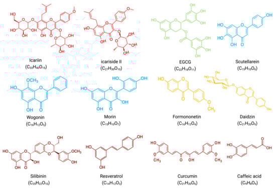 Molecular formulae and chemical structures of flavonoid compounds and non-flavonoid polyphenolic compounds(excluding PGJ, a plant extract rich in flavonoids). Flavonols(icariin, icariside II) have a red chemical formula. Flavan-3-ol (EGCG) is green in color. The formula of flavones (scutellarein, wogonin, morin) is blue. The chemical formula of isoflavones (formononetin, daidzin) is yellow. Non-flavonoid polyphenols (silibinin, resveratrol, curcumin, caffeic acid) have a brown chemical formula.