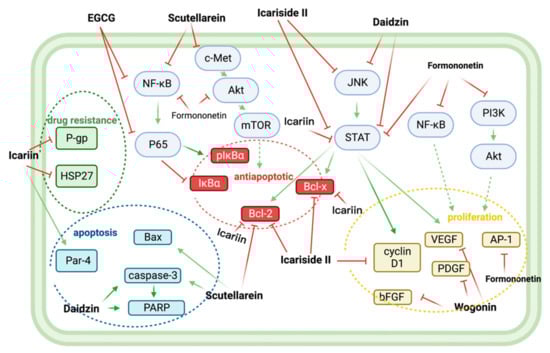 Nine flavonoids (icariin, icariside II, EGCG, scutellarein, wogonin, morin, formononetin, daidzin) plus a flavonoid-rich plant extract (PGJ) synergize with BTZ in anti-MM by regulating proliferation, apoptosis, and drug resistance-related signaling pathways (Figure 6) (Table 3).