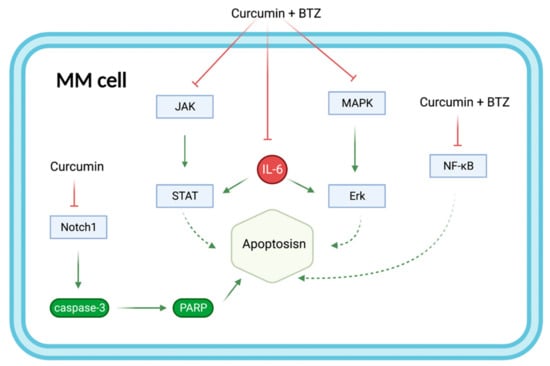Curcumin enhances the apoptotic effect of BTZ on MM cells by regulating multiple signaling pathways (Figure 7). The bone marrow microenvironment, in which bone marrow stromal cells (BMSCs) interact with MM, influences the survival and growth of MM cells. In vitro, curcumin inhibited the activation of JAK/STAT and MAPK pathways in U266 cells after treatment with BMSCs cell supernatant. Additionally, curcumin and BTZ co-treatment efficiently prevented IL-6-induced STAT3 and Erk phosphorylation, increased PARP cleavage, and decreased pro-caspase-3 levels. Through these mechanisms mentioned above, this combination inhibited the growth of U266 cells and promoted apoptosis []. After that, in another trial, curcumin enhanced the inhibitory effect of BTZ on NF-κB activation in U266 cells, leading to increased apoptosis. In vivo, the combination group was more potent than the BTZ group in reducing tumor volume []. Moreover, curcumin increased the expression of cleaved caspase-3 protein by inhibiting the Notch1 signaling pathway, which increased the drug sensitivity of RPMI-8226 cells and U266 cells to BTZ [].