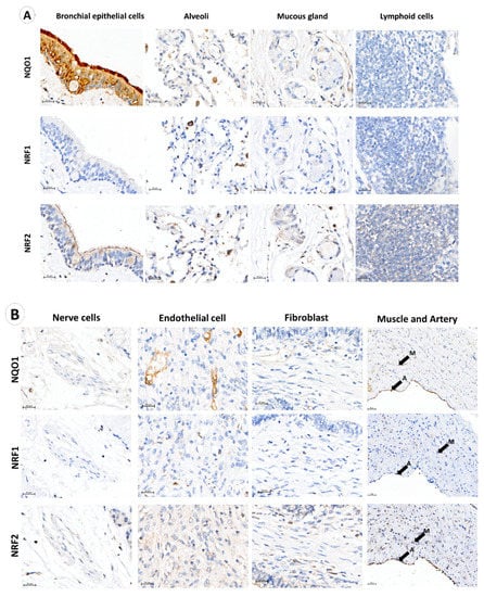 A total of 162 stage I and II adenocarcinoma NSCLC samples meeting the criteria were included in this study. Immunohistochemistry (IHC) was performed to quantify NQO1 expression in the cytoplasmic compartment of the cells after deciding the optimal dilution of the NQO1, NRF1 and NRF2 antibodies by assessing specificity, consistency, and signal-to-noise ratio [36]. Individual IHC staining of NQO1, NRF1 and NRF2 enabled the observation of protein expression by DAB chromogen brown color intensity within normal cell types, such as bronchial epithelial cells, alveoli, mucosal glands, lymphoid cells, nerve cells, endothelial cells, fibroblasts, muscle cells and arteries (Figure 1), and cancer cells. Immunostaining showed that NQO1 was positive in bronchial epithelial cells and endothelial cells, demonstrating increased NQO1 expression in ciliated surfaces when compared to the cytoplasm of columnar epithelial cells and basal cells (Figure 1A). NRF1 expression in bronchial epithelia was negative; however, NRF2 showed moderate cytoplasmic expression in columnar epithelial cells, cilia, and negative basal cells. In endothelial cells, NQO1 was strongly expressed; however, in mucous glands, lymphoid, neural, muscle and fibroblast cells, NQO1 was lowly expressed. Contrastingly, NRF2 protein was positive in lymphoid cells, and NRF1 was detected in some lymphoid cell subtypes, as shown in Figure 1. NRF1 was detected in endothelial cells; however, negative across fibroblasts, muscle, arteries and arterioles, neural cells, and mucous glands. NRF2 was present in alveolar, neural, endothelial and mucosal cells, with negative reactivity in fibroblasts.