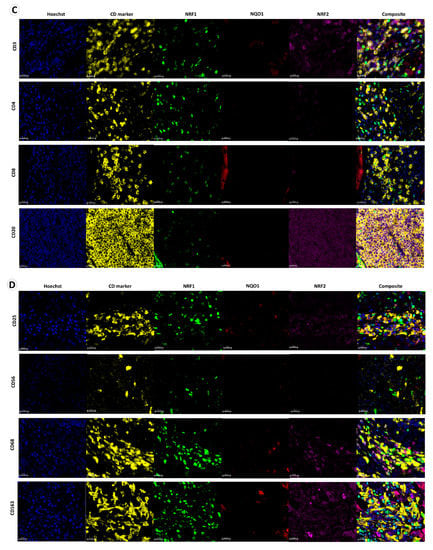 IHC is, at best, a semi-quantitative technique and is limiting for protein co-localization analysis. Therefore, multiplexed immunofluorescence (mIF) was performed to visualize NQO1, NRF1, NRF2, and pan-cytokeratin simultaneously. Pan-cytokeratin was utilized to classify tumors and TME regions by a deep learning neural network algorithm, DenseNet AI using Indica Labs’ HALO platform. mIF enabled the quantitative assessment of NQO1 expression within tumor and TME regions [34]. Furthermore, to distinguish several different immune cell types and to measure NQO1, NRF1 and NRF2 expression, mIF was performed again by labeling NQO1, NRF1, NRF2 together with a cluster of differentiation (CD) markers; CD3–pan T-cell receptor, CD4–helper T-cell, CD8–cytotoxic T-cell and CD25–activated T-cell, CD20- B cells, CD56- natural killer cell, CD68-pan-macrophage and CD163-dendritic cells. NQO1 protein expression was negative across all lymphoid cell subtypes (Figure 1C,D). NRF1 expression was observed in CD8+ and CD25+ T-cells, CD20+ B cells, CD68+ macrophages and CD163+ dendritic cells, and negative in CD4+ and CD56+ cells (Figure 1C). NRF2 expression was observed in CD20+, CD25+, CD68+ and CD163+ cells. However, NRF2 was low in CD3+ cells and negative in CD4+, CD8+, CD56+ cells (Figure 1C,D). Colocalized expression of NRF1 and NRF2 was observed in CD68+ cells.
