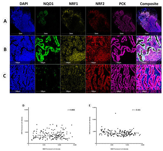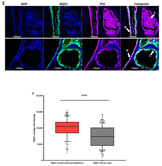 The correlations between NQO1 and NRF1 or NRF2 were evaluated as previously shown in mouse model research, suggesting a positive correlation between NRF2 and NQO1 expression [20]. Averaged fluorescent signal intensities of NQO1, NRF1 and NRF2 from the whole cohort were plotted using Spearman’s correlation coefficient (Figure 3D,E), which demonstrated no correlative relationship between NQO1 and NRF1 (r = 0.002) or NQO1 and NRF2 (r = −0.161) expression in cancer cells.
