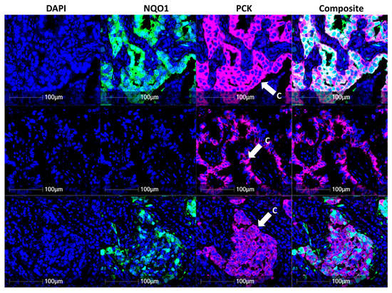Figure 2. NQO1 heterogeneity in lung adenocarcinoma. The expression of NQO1 in cancer cells was examined across the NSCLC cohort using DAPI (blue nuclear stain), NQO1 (green) and pan-cytokeratin (pink cell structure stain highlighting bronchial epithelium and cancer cells). Composite images display DAPI, NQO1 and pan-cytokeratin overlay. C denotes cancer cells.